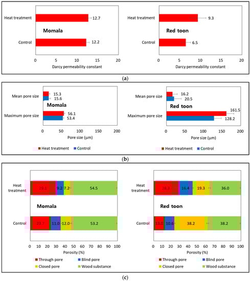 Figure 4 provides the variations of gas permeability, pore size, and porosity in both wood species. The gas permeability of momala prior to heat treatment was 12.2 Darcy, which increased approximately 4.3% to 12.7 Darcy (t = −1.995, p < 0.10, paired t-test) after heat treatment (210 °C for 6 h). The gas permeability of red toon prior to heat treatment was 6.742 Darcy, which increased by approximately 38.5% to 9.3 Darcy (t = −7.949, p < 0.01) after heat treatment.
