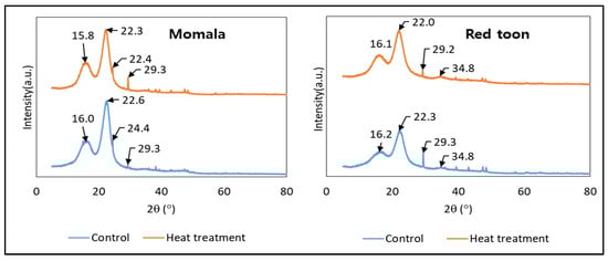 Figure 5 illustrated the XRD analysis of momala and red toon before and after heat treatment. The peaks at 16.0, 22.6, and 24.4 for untreated momala are transferred to 15.8, 22.3, and 22.4 in heat-treated momala sample. Additionally, the peaks at 16.1 and 22.0 for un-treated red toon are transferred to 16.2 and 22.3 in heat-treated red toon. The cellulose crystallinity is found to be 51.0% for untreated momala and 36.9% for heat-treated momala, while 52.2% for untreated red toon and 37.8% for heat-treated red toon.