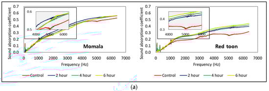 The red toon sound absorption coefficient increased as heat treatment time increased. The rate of the average sound absorption coefficient at 2000–6400 Hz increased by 38.6% (t = −19.5301, p < 0.001) during 6 h of heat treatment. The heat treatment changed the pore structure and improved the through-pore porosity, causing an increase in gas permeability that was confirmed by the improved average sound absorption coefficient at 2000–6400 Hz. This phenomenon was identical to that in momala.