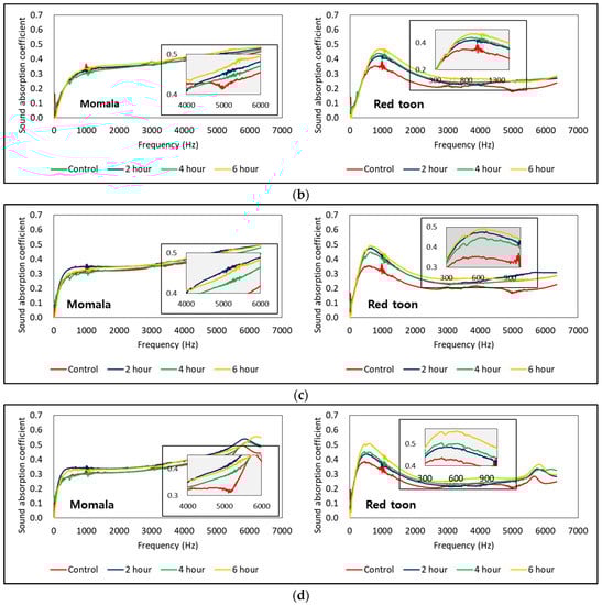 Alterations in sound absorption curves according to heat treatment time of momala and red toon with air back cavities of different sizes. (a) 1-cm air back cavity; (b) 2-cm air back cavity; (c) 3-cm air back cavity; (d) 4-cm air back cavity.