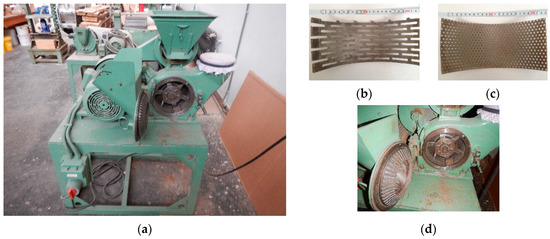 Milling of wood chips using the SU1 impact cross mill (TMS, Pardubice, Czech Republic): (a) view of the equipment with grinding segments defining the particle size; (b) grate for central particles; (c) grate for surface particles; (d) a detailed view of the grinding device.