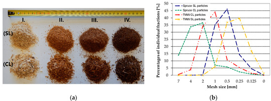 Particles for particleboards (PBs): (a) The spruce (I.) and thermally modified wood (TMW) particles of (II.) pine; (III.) beech; (IV.) ash used in surface layers (SL) and core layer (CL); (b) Size characteristics of the spruce wood and mixture of TMW particles—percentages of individual fraction for surface layers (SL) and core layer (CL).
