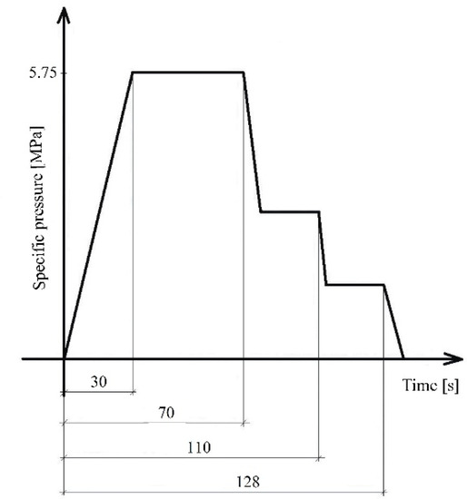 The 3-layer PBs with the dimension of 400 mm × 300 mm × 16 mm and with the density of 650 kg·m−3 ± 10 kg·m−3 were produced under laboratory conditions. UF resin with the hardener was applied on the conditioned wood particles in laboratory rotary mixing device (TU Zvolen, Slovakia). Wood particles mixed with the adhesive had moisture content from 9.1% to 10.4% (for the surface layers) and from 6.3% to 7.1% (for the core layer). Surface/core particles ratio was 35:65. The particle mats were layered manually in wooden forms. Each particle mat was cold pre-pressed at a laboratory temperature, at a pressure of 1 MPa, and then it was pressed in the CBJ 100-11 laboratory press (TOS, Rakovník, Czech Republic) in accordance with the pressing diagram (Figure 3), i.e., at a maximum temperature of 240 °C, a maximum pressing pressure of 5.75 MPa, and a pressing factor of 8 s/mm. In total, 24 PBs were manufactured, i.e., 6 from each type (Table 2).