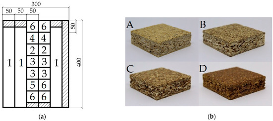 Scheme of samples preparation from the particleboard (PB) (a), i.e., 1—MOR and MOE by 3-point bending test [43], 2—TS and WA after 2 and 24 h [41,42], 3—IB [44], density [39], and moisture content [40], 4—decay resistance to the fungus Serpula lacrymans [46], 5—mould resistance [47], 6—spare samples; Display of PB-samples 50 mm × 50 mm × 16 mm with different amount of recycled TMW w/w (%) (b), i.e., (A) 0%, (B) 20%, (C) 50%, and (D) 100%.