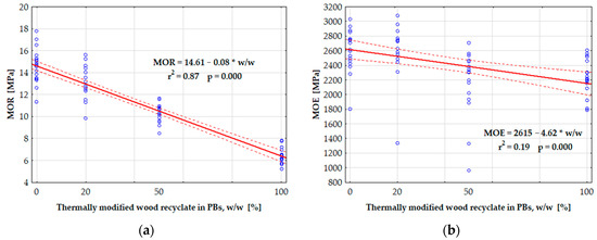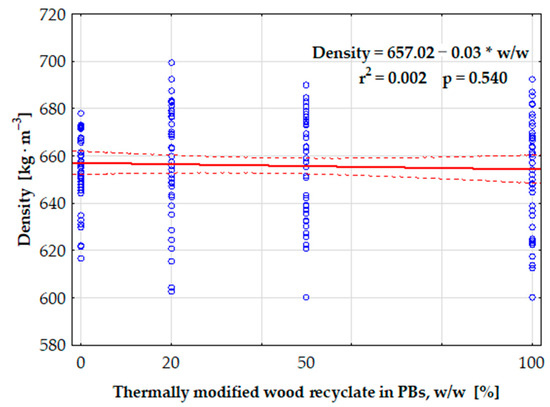 The basic physical and mechanical properties of PBs manufactured in the laboratories of TUZVO are presented in Table 3. The effect of recycled TMWs on the properties of PBs was analyzed by the linear correlations and the coefficients of determination r2 in Figure 5, Figure 6, Figure 7, Figure 8 and Figure 9.