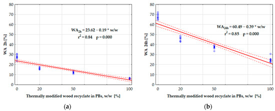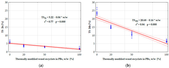 The moisture properties of PBs, i.e., the thickness swelling (TS) and water absorption (WA), significantly improved with higher portion of TMW particles in them. For example, TS-2h decreased from 6.01% for PB-C to 1.97% for PB-TMW-100; TS-24h decreased from 23.73% for PB-C to 6.58% for PB-TMW-100; WA-2h decreased from 27.40% for PB-C to 6.38% for PB-TMW-100; and WA-24h decreased from 68.18% for PB-C to 24.55% for PB-TMW-100 (Table 3). The effect of the recycled TMW particles on the moisture properties of PBs was in all cases considered as significant, as values of the coefficient of determination r2 for the linear correlations “TS or WA = a + b × w/w” were high and ranged between 0.77–0.85, at which p was always 0.000 (Figure 6 and Figure 7). Achieved results related to a better moisture resistance of PBs containing the TMW particles can be explained by their most evident hydrophobic characters compared to particles from fresh spruce wood [12].