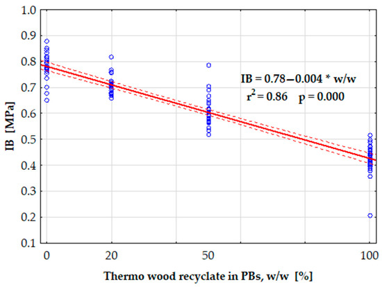 Presence of the TMW particles in PBs had a negative effect on their mechanical properties—significantly and very apparently on the modulus of rupture (MOR) and internal bond (IB) with r2 equal to 0.87 and 0.86 for the linear correlations “MOR or IB = a + b × w/w” (Table 3 and Figure 8a and Figure 9). The TMW particles had also a significantly negative effect on the modulus of elasticity (MOE) of PBs, however, with a lower manifestation when r2 of the linear correlation “MOE = a + b × w/w” was only 0.19 (Table 3 and Figure 8b).