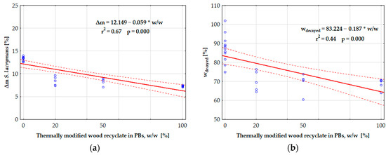 Biodegradation of PBs with the brown-rot fungus Serpula lacrymans was more suppressed if the boards contained higher number of particles from the recycled TMWs (Table 4, Figure 10). This result is in accordance with work of [64], by which the resistance of PBs to decaying fungi and termites increased with using of higher number of particles from more durable wood species. The reference PB-C had the greatest mass loss (Δm equal 13.20%), while the PB-TMW-100 containing only particles from TMW offcuts had the smallest mass loss (Δm equal 7.26%)—so the Δm decreased by 45%. The coefficient of determination r2 of the linear correlations “Mass loss = a + b × w/w” was 0.67, on the basis of which a less intense decay of PBs containing TMW particles was confirmed with high significance (Figure 10a). Validity of the performed decay test was confirmed by an enough virulence of the fungal strain which at the Pinus sylvestris sapwood samples caused mass loss of 26.80%, i.e., more than the level 20% required for this reference wood species by standard EN 113 [65].