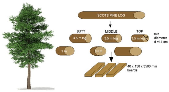 The research materials consisted of a batch of Scots pine timber (Pinus sylvestris L.) composed of 510 pieces with the nominal cross-section dimensions of 40 × 138 mm, and a length of 3.5 m. The timber was obtained from a middle-sized sawmill in Poland. The technical quality of the stand was 2, which corresponds to stands that are usually well adjusted to the habitat, with good development dynamics, healthy, straight, and where well cleaned tree-length trunks are expected to provide good quality sawn timber. The timber was acquired from raw wood that was approximately 120 years old. Roundwood came from trees growing in moist-mixed forest. The timber was obtained from three types of logs: butt (170 pieces), middle (170 pieces), and top (170 pieces; Figure 1). After logging, the timber was dried in industrial conditions in a chamber drier, up to the humidity of ca. 12%, and sawn.