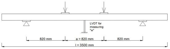The next stage of research consisted of measuring the static modulus of elasticity (MOE) and static bending strength—modulus of rupture (MOR)—in line with [37], with the use of a universal resistance machine TIRA Test 2300 (TIRA GmbH, Schalkau, Germany). The tests were performed with displacement control (load head speed 3 mm/min) according to the diagram presented in Figure 2. After the test, a sample of wood free from defects and covering the entire cross-section was taken from the rupture area of each board to measure the timber density (DEN) and moisture content using the oven dry method.