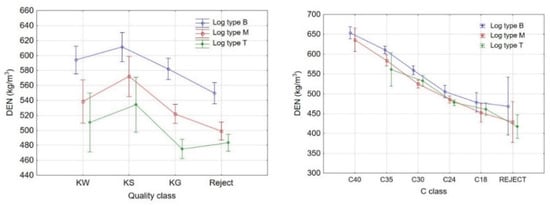Statistical analysis of test results was carried out in Statistica v.13.3 software (StatSoft, Inc., Tulsa, OK, USA). The obtained values for the physical and mechanical properties were analysed as average values, taking into account the standard deviation. Two-factor variance analysis (ANOVA) was performed for the physical and mechanical properties of Scots pine sawn timber (DEN, MOE, MOR)—depending on the log type (B—butt, M—middle, T—top) and sawn timber quality—obtained from machine strength grading and expressed by a C class [14], and with grading classes determined on the basis of visual strength grading (KW, KS, KG, Reject) [36]. All the tests were carried out for a significance level of p < 0.05.