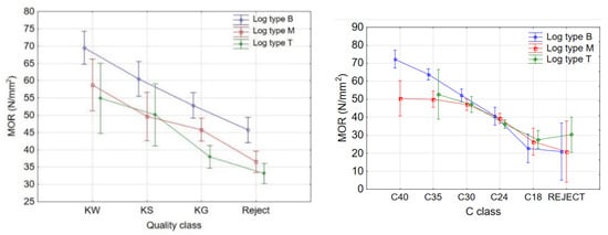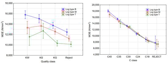 On the basis of Figure 4, it can be observed that the MOR decreased from the butt log section to the top log section. The MOR values of timber from the grading classes determined by visual strength grading, independently of log type, were lower for lower quality pieces. Moreover, the ANOVA (Table 2) showed a direct relationship between the MOR value and the type of log, as well as the C strength classes—both as independent influences of the individual factors, and in case of both factors acting at the same time. On the basis of research carried out on Norwegian spruce timber, it was confirmed that a higher vertical position in the tree leads to a decrease in MOR values [46]. The reduction of MOR values can reach as much as 20% in the case of differences between stem height levels of 35% and 65% [47]. In the case of spruce wood, there is a similar correlation between the type of log and the timber’s bending strength. Wood from butt logs had an average MOR of 56 MPa, while the MOR of timber from top logs was 45% lower [8].
