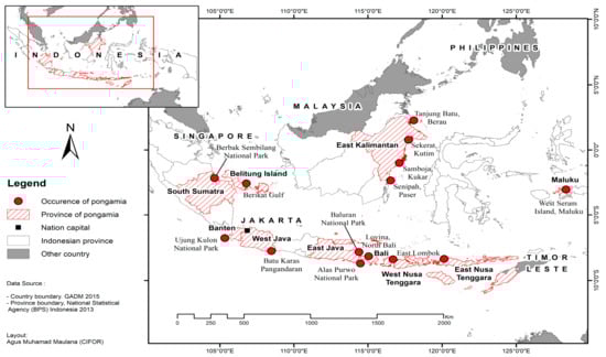 Natural distribution of pongamia in Indonesia, adapted from Refs. [28,35,36,37].