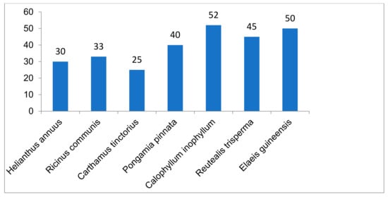 During the past few decades, pongamia oil has attracted considerable attention as a potential renewable, biodegradable, eco-friendly, non-toxic fuel [27] and as being economically viable [52]. Studies have determined oil yield and properties with 1000 kg of pongamia seeds yielding 270–300 kg of crude pongamia oil [49]. In other studies, oil yield was reported to reach up to 35% by weight [27,57], with some reports showing yields of up to 40% [50,58]. Crude pongamia oil needs further processing (transesterification) to give methyl esters. Around 85–90 L of biodiesel and 15–16 L of glycerin (considered a by-product) can be obtained from 100 L of crude pongamia oil by transesterification [49]. Meanwhile, other studies have found approximately 4 kg of pongamia seeds being required to produce one liter of crude pongamia oil, which in turn could yield 0.896 L of biodiesel [59]. The major cost of biodiesel production from pongamia is the feed stock, which can account for 60% of total production costs, followed by chemical costs for transesterification at 17%, and operating costs at 10% [60]. Therefore, high seed yield is the key to successful pongamia biodiesel production. A study on the economic viability of pongamia biodiesel production in Fiji [61] showed the levelized cost of biodiesel to be USD 1.44 per liter and the benefit–cost ratio to be 1:06. Table 2, Table 3 and Table 4 below detail properties of crude pongamia oil. It is worth noting that pongamia can yield a considerable volume of biodiesel in comparison with other biofuel-producing species (see Figure 5). However, the oil content of pongamia may vary depending on seed source, processing methods (i.e., hydraulic press, mechanical press or solvent extraction) and equipment used (Table 5).