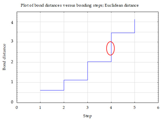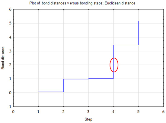 Ward’s method was used to determine the number of clusters. The choice of three clusters was confirmed by the plot of changes in the distance of bonds in successive agglomeration steps (Figure 1). This was the first significant increase in the agglomeration distance after a longer period, where the graph was relatively “flat”. A bond distance of two in the tree diagram indicated three clusters (where the dendrogram intersected). In the k-means method, the number of clusters was assumed to be k = 3 and the maximum number of iterations was set to 10 (Figure 2).