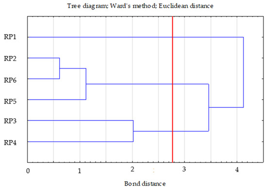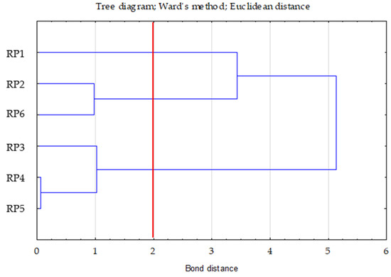 The first cluster included one case (RP1—0.00 (distance from the centre of the right cluster)), the second included three (RP3—0.30; RP4—0.16; RP5—0.16), and the third included two (RP2—0.28; RP6—0.28). In cluster two, the RP4 and RP5 variants were very similar to each other.