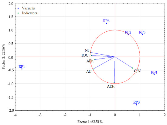 Test points RP2, RP3, RP4, and RP5 had lower values of TOC and Nt, and lower content of phosphatase and urease than the other two variants. Test points RP1 and RP6 had lower C/N ratio values than the other variants. Considering the second dimension (factor), it can be seen that test points RP1, RP3, and RP4 had higher dehydrogenase activity than the other variants.