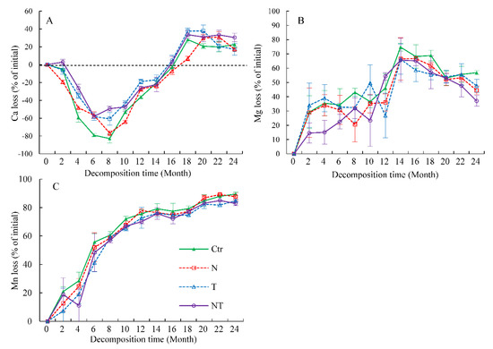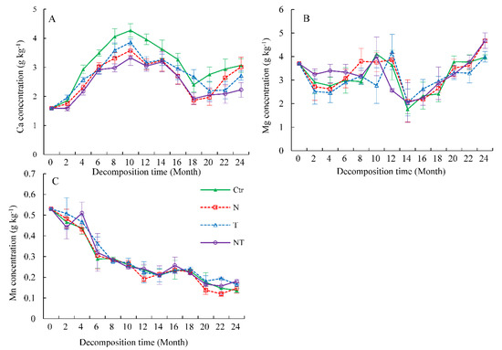 Changes in concentrations of Ca (A), Mg (B), and Mn (C) in leaf litter exposed in the field during the two-year experiment. Error bars represent standard deviations of the means (n = 3). Ctr: without nitrogen deposition or throughfall reduction, N: nitrogen deposition (150 kg·N·ha−1·y−1), T: throughfall reduction (10%), NT: nitrogen deposition (150 kg·N·ha−1·y−1) and throughfall reduction (10%).