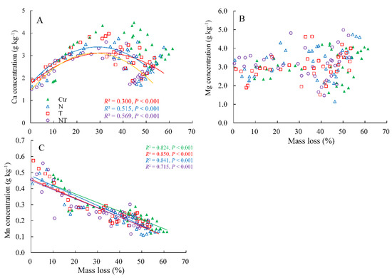 Relationships between Ca (A), Mg (B), and Mn (C) concentrations and mass loss in different treatments. Abbreviations of treatments are given in Figure 1.