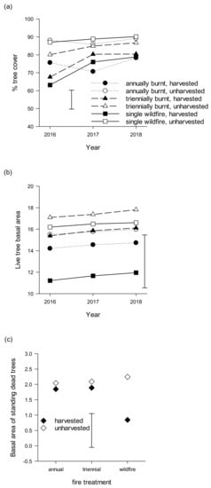 Variation in mean (a) tree cover (%) and (b) live tree basal area (m2/ha) over time after harvesting (in 2015) in the different harvesting and fire treatments, where there was a significant time × fire treatment × harvesting interaction (p < 0.001) for tree cover, but no significant interaction (p > 0.05) for live tree basal area; and (c) variation in the basal area of standing dead trees in the different harvesting and fire treatments, where the fire treatment × harvesting interaction was significant (p = 0.009). The error bar indicates the LSD in each case.