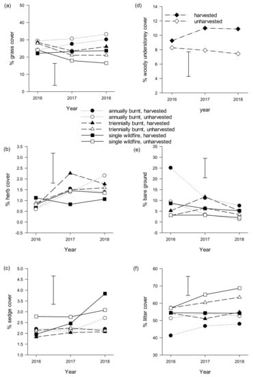 Variation in mean percentage cover of different attributes over time in harvested and unharvested transects. There were significant time × fire treatment × harvesting interactions for: (a) perennial grasses, (b) herbs, (c) sedges, (e) bare ground and (f) leaf litter; and a significant time × harvesting interaction for woody plant understorey cover (d). Prescribed burns took place in 2015 in the annually burnt treatment and 2016 in the triennially burnt treatment. The error bar indicates the LSD.