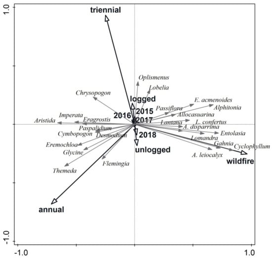 Plant species richness was not significantly influenced by fire treatment or harvesting and did not vary significantly over time (p > 0.05 in all cases). In addition, no interaction terms were significant for this variable (Appendix A). On average 12.9 plant species were recorded on a given 100 m transect. However, there was a significant positive relationship between species richness and harvest intensity in 2018 (F1,28 = 10.8, p = 0.003, adjusted-R2 = 0.25) that was not seen in other years (p > 0.05) suggesting some lag in species richness response after harvesting. Fire treatment and harvesting both had a significant influence on plant taxa composition (pseudo-F = 15.7 and 2.4, respectively, p = 0.002 in both cases). Year of sampling did not influence plant composition (pseudo-F = 0.8, p > 0.05) in this relatively short-term study. The full model explained 25.5% of the variation in taxa composition. Variance partitioning showed that fire treatments accounted for 96.4% of the explained variation and harvesting accounted for just 4.8% of the explained variation, with 1.2% of the variation explained by the combined effects of fire treatment and harvesting. There were a group of taxa that were more abundant in the single wildfire treatment, including Acacia leiocalyx, Gahnia aspera, Cyclophyllum coprosmoides, Lomandra sp. and Entolasia stricta (Figure 4). Grass species and herbs were more abundant in the frequently burnt treatments (Figure 4), with species such as Themeda triandra, Flemingia parviflora, Glycine clandestina and Eremochloa bimaculata more strongly associated with annually burnt areas. Only two non-native species (Lantana camara and Passiflora suberosa) were recorded during this study and both were weakly associated with the wildfire treatment (Figure 4).