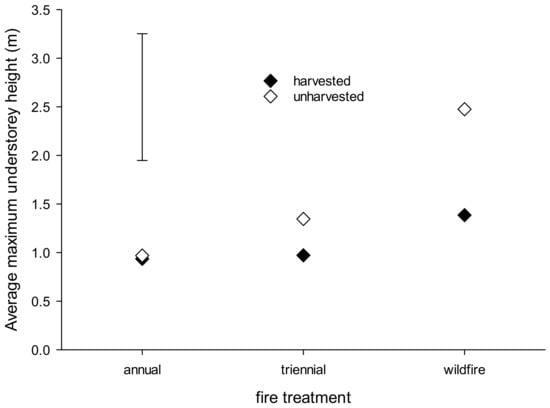 Mean maximum understorey vegetation height for harvested and unharvested transects in each of the three fire treatments. There was a significant fire treatment × harvesting treatment interaction (p < 0.05). The error bar indicates the LSD based on fire treatment × harvesting treatment interaction.