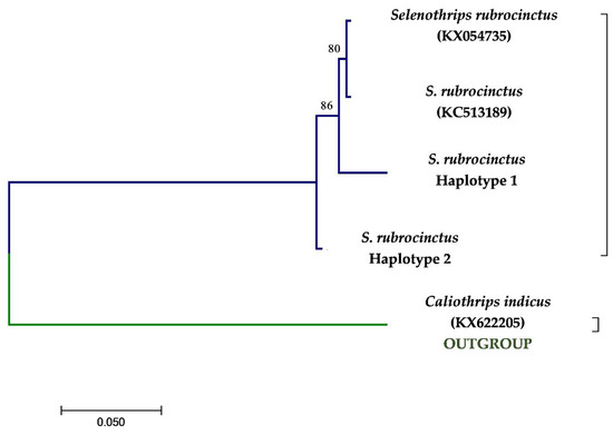 Bootstrap consensus tree generated using the Neighbour-Joining method and general time reversible (GTR) G + I (gamma + invariant) model showing the genetic differences and relationship among S. rubrocinctus haplotypes obtained by mt-COI sequences. S. rubrocinctus sequences [38,39] available in NCBI are included and Caliothrips indicus was used as an outgroup. Species names and GenBank accession numbers are shown in the figure.
