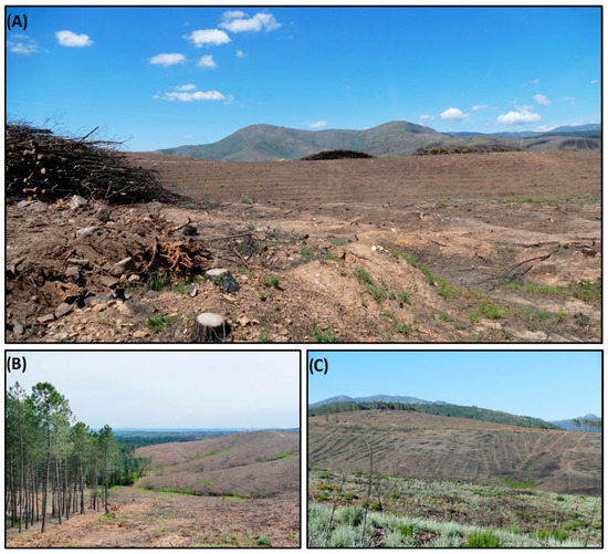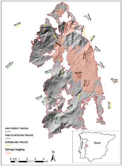 The first two years after the fire, the Forest Planning and Management Service of the Regional Government (Extremadura, Spain) implemented a series of management practices in the burnt area [40]: (1) the construction of dikes, girdles, and ridges to reduce erosion; and (2) the construction and maintenance of forest roads to improve access. Moreover, several management practices were selectively applied to the three main habitat types (Figure 1). In the oak forest, only the completely burnt trees were cut down, although these actions were suspended until 2016 in order to examine the natural regeneration and regrowth capacity of the burnt trees. The scrubland underwent no intervention and was left to natural regeneration. In the burnt pine forest area, salvage logging was carried out, including hauling trees, trimming, stripping, bucking, and stacking for later hauling (Figure 2). The removal of burnt pine wood was performed to avoid pests and diseases, especially the spread of the pine nematode Bursaphelenchus xylophilus. All trees with more than 50% of the canopy burnt were felled, leaving only a small stand with less than 20% of the canopy burnt and located on a slope greater than 20%. The remediation in the pine forest area began immediately after the fire in September 2015 and spanned the autumn and winter months.