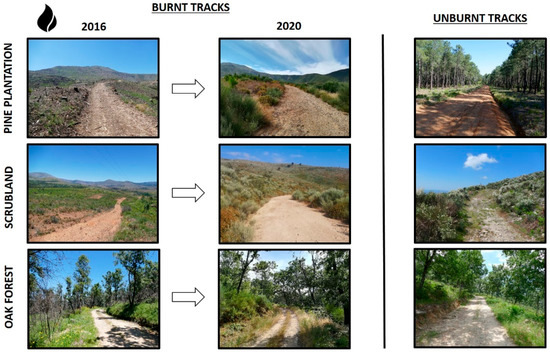 Pictures of unburnt and burnt landscapes in 2016 (one year after the fire) and 2020 (five years after the fire). Pictures are grouped according to the three habitat types: pine plantation, scrubland, and oak forest.
