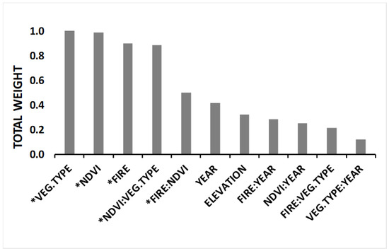 Ranking of the importance of explanatory variables considered to model lizard abundance in the Gata valley. Variables that made up the best model are marked with an asterisk.