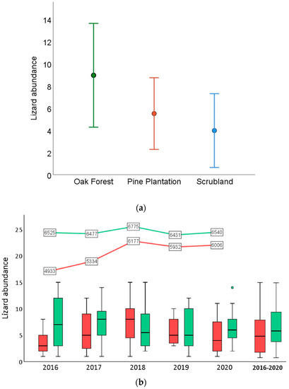 In our study, natural habitats (oak forest and scrubland) appeared to offer better conditions in both parameters of reptile abundance and diversity. In contrast, pine plantation was characterized by sparse understory vegetation, a high canopy, and low food (arthropod) availability to lizards [20,60]. Moreover, the forestry management in monospecific pine plantations creates a homogeneous landscape with a lack of refuges for fauna. All these features discourage the appearance of reptile species and define the pine plantation as a low-quality habitat for these and many other organisms [61,62,63].