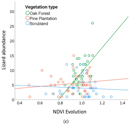 Four explanatory factors were important in explaining lizard abundance per transect (in descending order): vegetation type, NDVI, fire condition, and the interaction NDVI and vegetation type (Figure 4). The best-fitting models (Supplementary Materials Table S3) explained a high proportion of the variance of lizard abundance (R2 range from 0.625 to 0.610), and the best model confirmed the effect of these factors plus the interaction NDVI × Fire into lizard abundance (Table 2). Regarding vegetation type, oak forest was the habitat with the highest lizard abundance (Figure 5a). Lizards were more abundant in unburnt (average = 7.0 lizards per transect; range 0–28; S.D. = 5.1) than in burnt transects (average = 5.5; range 0–15; S.D. = 3.8), and this difference was especially marked in the first year of sampling (Figure 5b). The NDVI scores differed markedly the first and second year after the fire (2016 and 2017) and equaled from 2018 (top lines in Figure 5b). Lizard abundance increased in transects with higher NDVI values, and this relationship was strong in oak transects and weaker in pine and scrubland transects (Figure 5c).