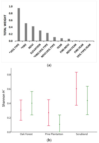 Modeling results of the Shannon index for the reptile community in transects surveyed in the Gata valley five years after the fire occurred in 2015. (a) Ranking of the importance of explanatory variables used to model the Shannon index. Variables that make up the best model are marked with an asterisk. (b) Differences in the Shannon index according to vegetation type and fire condition. Red and green represent burnt (red) and unburnt (green) average scores (points) ± standard deviation (whiskers).