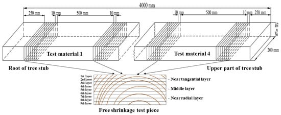 The small-diameter Pinus from the Greater Khingan Range forest area was processed into a size 4000 mm in length (fiber direction), 200 mm in width (near tangential direction of the upper surface layer and the near radial direction of the lower surface layer) and 50 mm in thickness (radial) to yield chord cut plate sawn timber with an initial moisture content of about 90%. The sawn timber was used to cut four 500 mm long conventional drying test materials used for the actual drying shrinkage performance, as well as free drying shrinkage performance test strips at both ends (six for each without obvious defects). The dimension of the test pieces along the length of sawn timber was fixed to 10 mm (fiber direction) × 200 mm × 50 mm. The test pieces were then decomposed into nine layers along the thickness of sawn timber to obtain test strips used for the free shrinkage performance of each layer in the thickness direction of the test timber. The layers were numbered sequentially from the upper surface layer in the near-chord direction to the lower surface layer in the near-radial direction.