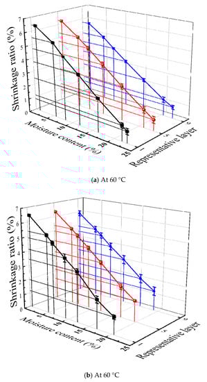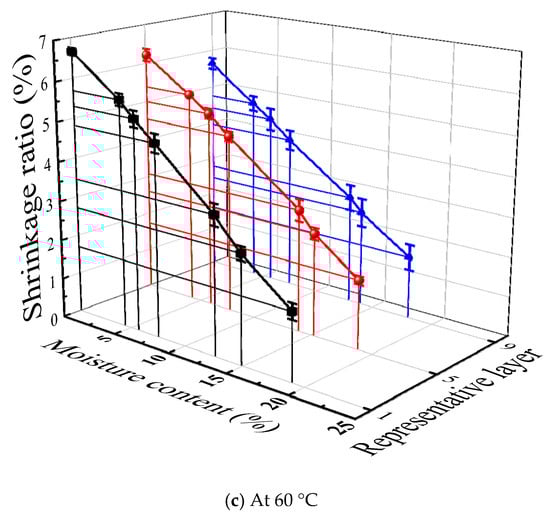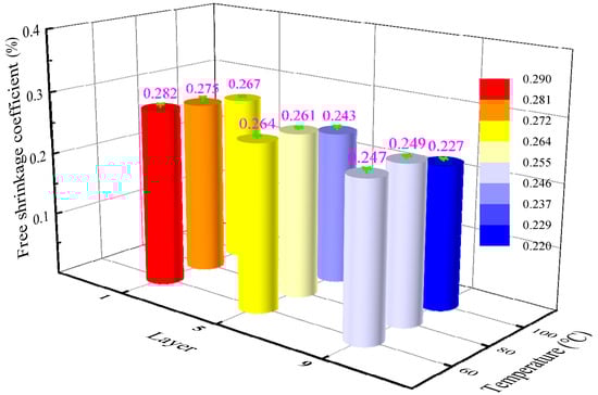 Except for the 9th layer, the free drying shrinkage coefficient in the width direction of other layers decreased as temperature rose, consistent with the law described by Jianfeng et al. [] showing a decline in free drying shrinkage coefficient of larch with temperature increase. The 9th layer enhanced slightly after temperature rose from 60 to 80 °C followed by a decrease as temperature further rose. The differences in the free shrinkage coefficient of representative layers (1st, 5th, and 9th) on the thickness of the test material at 60 and 100 °C were determined to be 0.015%, 0.021%, and 0.022%, respectively. Hence, the effect of temperature on the free shrinkage coefficient of the near-tangential layer was lower than that of the near-radial layer []. The influence of temperature on the free drying shrinkage coefficient of Mongolian Scotch pine revealed that the temperature increase probably caused curl between cellulose chain molecules, as well as enhancement in arrangement spacing between cellulose molecular chains, thereby declining free dry shrinkage coefficient as temperature rose [,,,]. However, the exact reasons would require further studies.