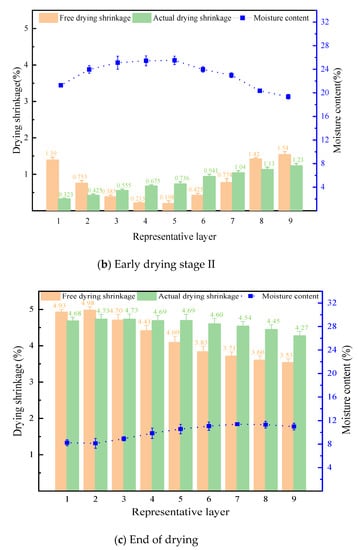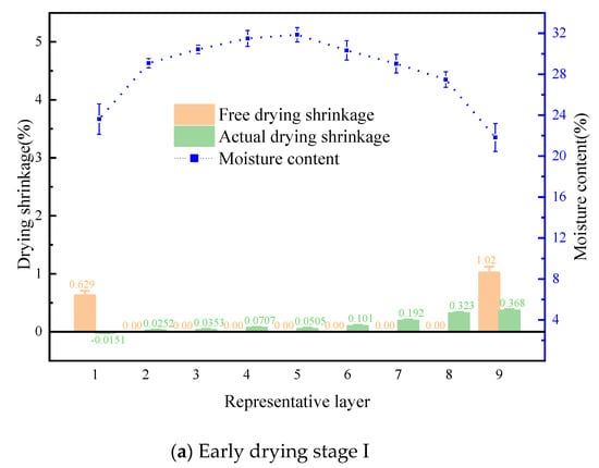 During drying to early-stage II, the moisture content of each layer was lower than FSP (Figure 4b). If not affected by internal and external forces, each layer drying shrinkage ratio would shrink freely according to Figure 4. The moisture content decreased from the high-value central layer to the surface layer. Moreover, free shrinkage at the corresponding moisture content increased from the low-value central layer to the surface layer. In addition to the surface layer, the actual drying shrinkage rate of the subsurface layer (2nd and 8th) was also less than the free drying shrinkage rate. Besides, the actual dry shrinkage rate of each internal layer was greater than the free drying shrinkage rate. The changes in deformation from early-stage I drying to early-stage II are depicted in Figure 5. From early-stage I drying to early-stage II, the parts producing tensile stress and tensile deformation (negative value) extended from the surface to the subsurface layers, while the parts producing compressive stress and compressive deformation (positive value) shrunk to inner layer. The increase in the tensile deformation of the 1st layer indicated the continuously restrained internally drying shrinkage of the layer, thereby bearing the tensile stress. By comparison, the decrease in the tensile deformation of the 9th layer indicated the inhibition of the drying shrinkage to the adjacent inner layers by the layer with tensile deformation in early-stage I. This produced compressive stress in the subsequent drying processes. The compression deformation of all four layers increased. Thus, the interior continued inhibiting the dry shrinkage of the surface layer while still bearing the compressive stress [].