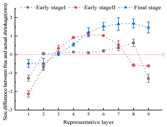 The relationship between the actual drying shrinkage and the free drying shrinkage of different layers on the thickness of Pinus at various moisture contents (early-stage I with average moisture content of 28%, early-stage II with average moisture content of 24%, and the end of conventional drying with average moisture content of 10%) are presented in Figure 4. The free drying shrinkage rate was obtained from the relationship between the above free drying shrinkage coefficient and temperature (Equation (2)). The difference between possible size during the drying of the test material and the corresponding moisture content in the width direction of different layers at various stages (early-stage I, early-stage II and the end of the drying period) and the actual size of the test material dried at corresponding moisture contents (difference in size after free and actual drying shrinkage) is shown in Figure 5. Note that the trend visually described the changes (deformations) in size under drying stress. The ratio to the original size consisted of drying strain composed of elastic strain, viscoelastic creep strain, and mechanical adsorption creep strain generated under drying stress. The percentage represented the difference between the actual drying shrinkage rate and free drying shrinkage rate shown in Figure 4.