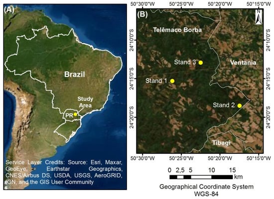 Location of the study area in Brazil, in the state of Paraná (A) and in Telêmaco Borba municipality (B).