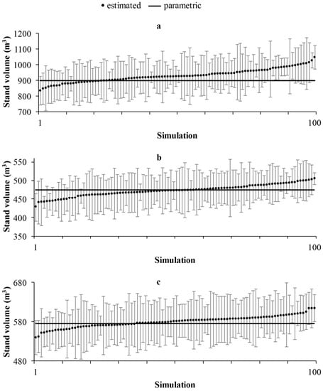 Confidence interval and stand volume based on simulations in the area approach (conventional forest inventory). (a) Pinus taeda—16 years old (stand 1); (b) Pinus taeda—7 years old (stand 2); (c) Eucalyptus urograndis—5 years old (stand 3).