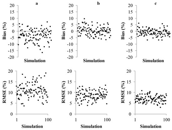 Bias and RMSE for simulations using the area approach in stand 1 (a), stand 2 (b), and stand 3 (c).