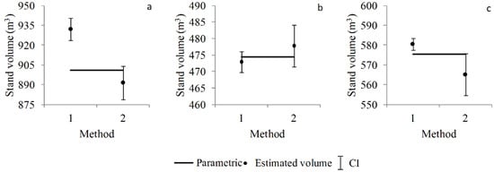 Upon comparing the two approaches (Figure 4), we noted that the parametric value was included in the confidence interval (CI) for all stands in the individual approach (method 2).