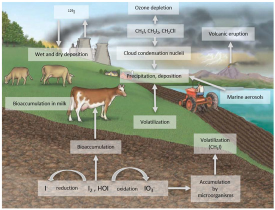 The geochemistry of iodine is extensively presented in works of Fuge and Johnson [11,12] who highlighted that the iodine transformation in the environment is a dynamic cycle between “living and non-living” and “organic and inorganic” (Figure 1). There, iodine passes from the main environmental matrices into plants, and then into animals and humans, where it is part of various organic compounds and hormones [13].