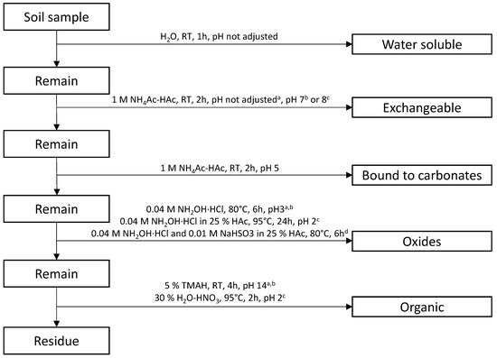 Extracting agents and conditions used for iodine fractionation from soil in selected studies. RT—room temperature; TMAH—tetramethylammoniumhydroxide, a [33], b [34], c [68], d [65].