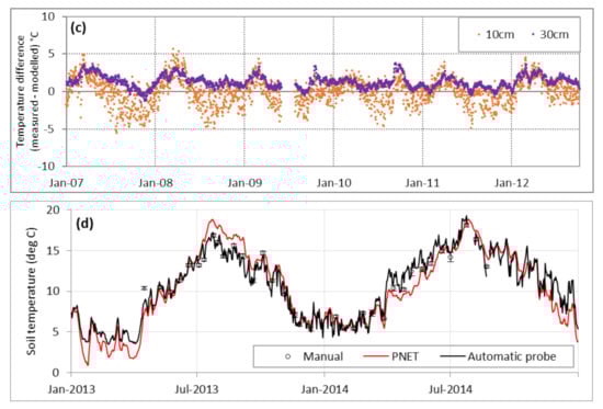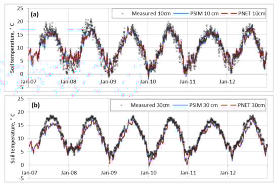 Simulated daily mean soil temperature data at 10 cm depth from January 2007 to December 2012 were similar to measurement data (Figure 1a, y = 0.8x (measured) + 2.1, R2 = 0.90), although they do not quite show the same degree of variation and have a 5–6 °C lower amplitude range, particularly in earlier years. Soil temperatures simulated at 30 cm depth were in closer agreement with measurements (Figure 1b, y = 0.9x − 0.6, R2 = 0.97).