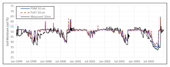 Simulated daily mean soil moisture data at 10 cm depth for January 1999 to December 2008 showed a general agreement with available measurements from 1999–2003 (Figure 2), including during the dry summer of 2003 (y = 0.5x + 23.7, R2 = 0.59). However, simulated values were only 2–5% higher in summer and 2–3% lower in winter. Data simulated with PSIM and PnET were similar except during summer 2003 when PSIM simulated lower soil moisture values, closer to measurements. Spikes of high simulated soil moisture (60–65%) from both modules indicate occasions when heavy rainfall has caused surface water to accumulate in the model, although this is not observed at the site, probably because of a slight slope or due to preferential flows that were not visible in the soil profiles used for initialisation.