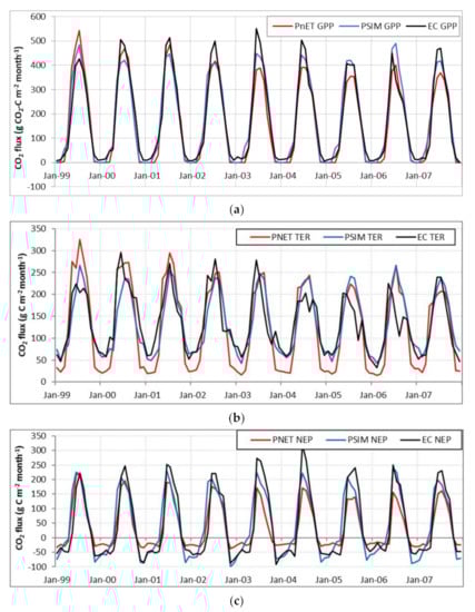 The PnET and PSIM module parameters were adjusted to optimise the fit of the simulations to measurements of annual EC data for GPP, TER and NEP for the period 1999–2007. For the evaluation period, simulations using these parameters were less meaningful because disturbances such as infestations of defoliating moth caterpillars in 2009 and 2010, which are not considered in the simulations, reduced the GPP, TER and, to a lesser extent, NEP, especially in 2010 []. It also seems that EC measurements during 1999 to 2010 also showed a significant long-term decrease in annual GPP (−46.1 g C m−2 year−1, p < 0.01) and annual TER (−44.7 g C m−2 year−1, p < 0.001), with no resultant trend for NEP []. These decreasing trends in annual GPP and TER are also represented in the simulations (Figure 3), although this might be partly due to the thinning event in 2007. Simulated annual values show larger declines when using PnET (from linear regression: −86.4 g C m−2 year−1 for GPP, R2 = 0.83, and −48.4 g C m−2 year−1 for TER, R2 = 0.87) than when using PSIM (from linear regression: −26.0 g C m−2 year−1, R2 = 0.52, and −21.7 g C m−2 year−1, R2 = 0.55, respectively) (see also Section 3.3).