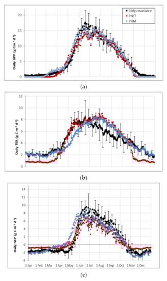 In the case of GPP, TER and NEP, measurements were not replicated and therefore no statistical significance could be derived for differences from simulated values, but RMSE values could be calculated. However, Oren et al. [] have estimated that most EC data have an error of 10%–15%, when measurement and gap-filling errors and spatial variability are considered, an error of 15% was therefore used to estimate the statistical significance of RMSE.