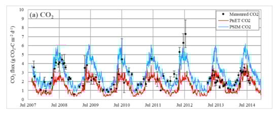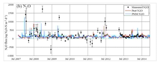 As soil temperature and soil moisture are major controls on GHG fluxes from soils, accurate simulation of these values is important, especially in the uppermost soil layers (0–30 cm) where most biological activity takes place [,]. Simulated soil temperature, using both PnET and PSIM, had a lower annual amplitude than measured data for most years. The only year studied when simulated temperature amplitude exceeded measured amplitude, 2013, had an anomalously dry summer (68 mm, compared with average summer rainfall of 167 mm) and a cold Jan–Mar (average temperature of 3.3 °C, compared with the equivalent for 1995–2013 of 5.8 °C), which suggests a link with climatic conditions. DNDC calculates soil temperature from soil properties including thermal conductivity derived from a combination of solid and water phases, depending on moisture content []. It seems that when the moisture content is high, the simulation of soil temperature is less accurate. The small difference of <1 °C in extreme values of PSIM and PnET soil temperatures is probably generated in the ECM air chemistry module due to differences in canopy structure, which causes shading, and evapotranspiration, before soil surface temperatures are calculated in the DNDC soil microclimate module.