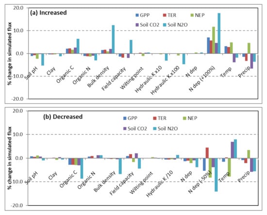 Sensitivity tests showing % change in simulated annual CO2 and N2O fluxes with input values (a) increased by 10% and (b) decreased by 10% (except pH: changed by 1 unit, soil hydraulic conductivity: changed as shown, and N dep: ±10% and +100% or −50% change). Simulations using PnET module.